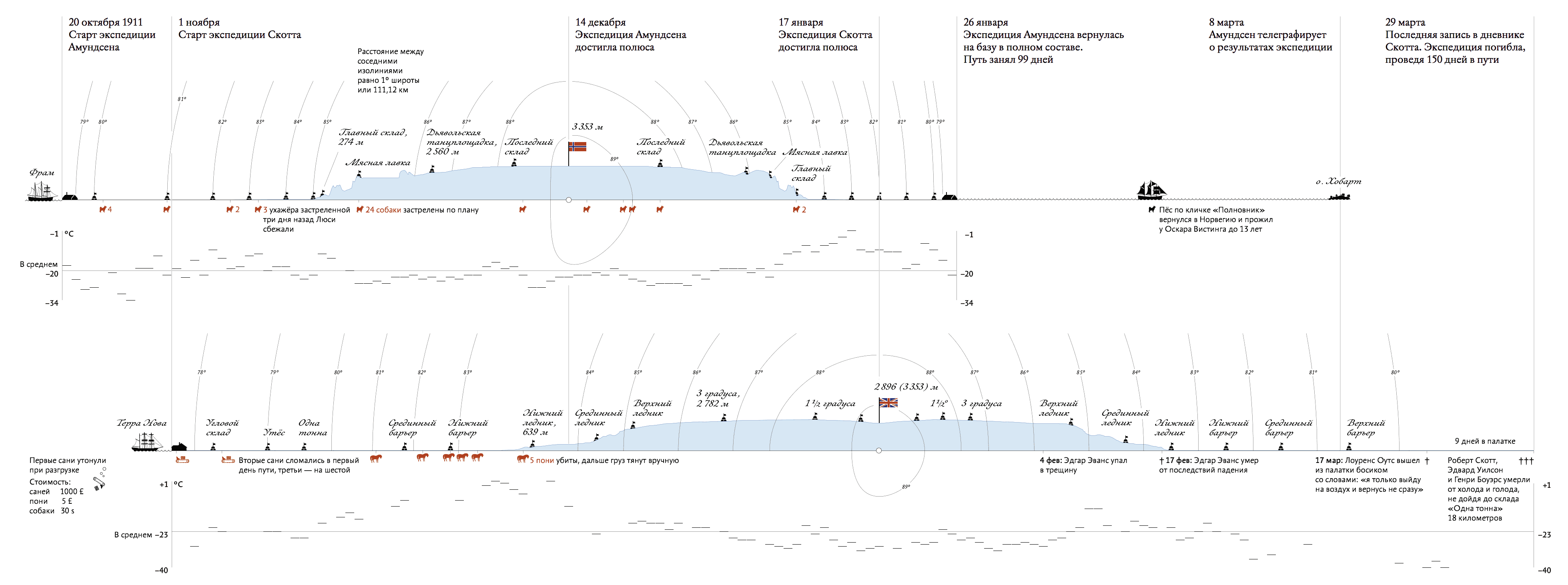 Интерактивные диаграммы полярной гонки Скотта и Амундсена. В ведре еще можно почитать обо всех масштабных раскопках в источниках информации и ручной переработке данных.