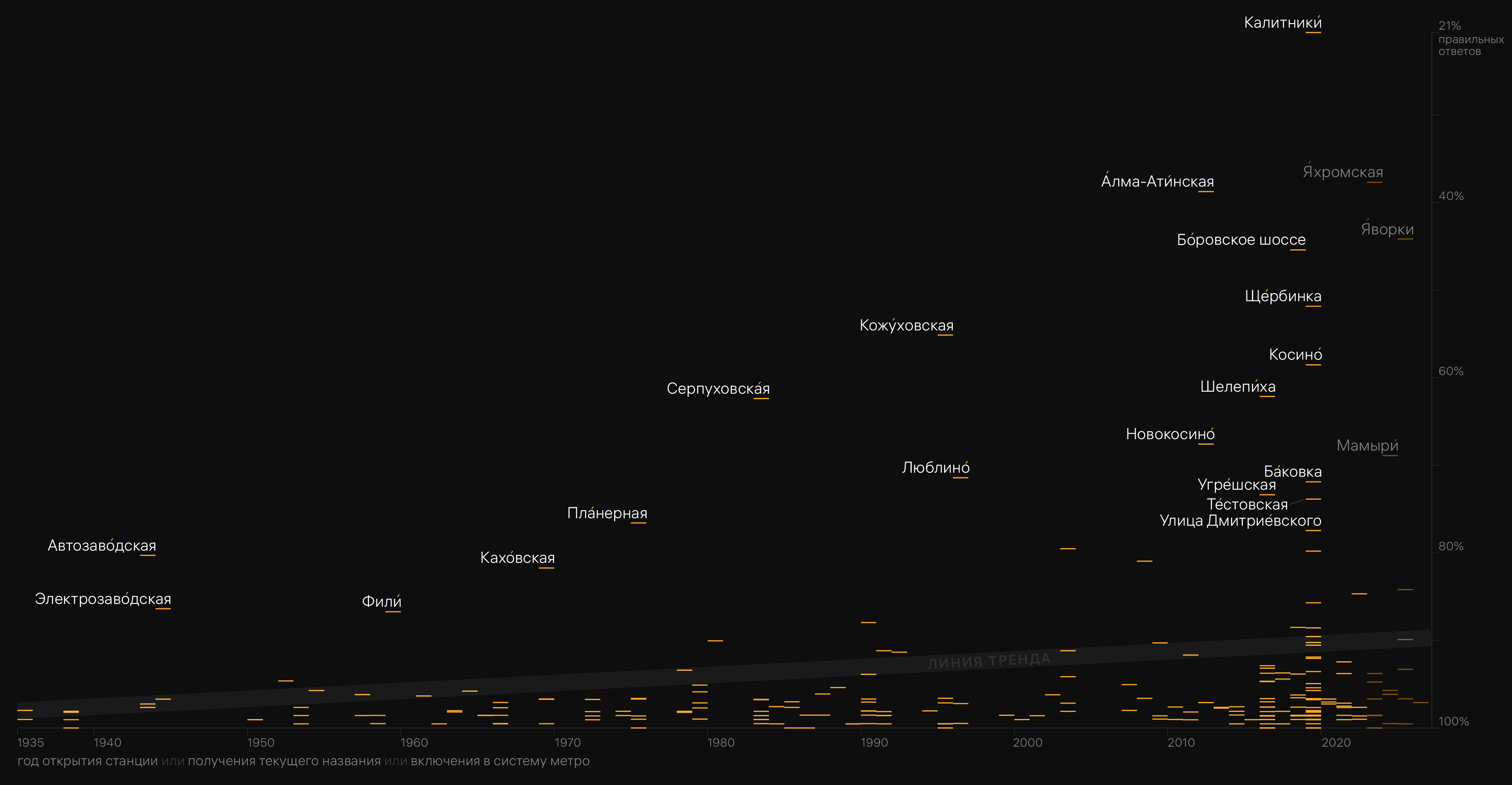 Первые результаты инициативы с ударениями в топонимах: 452 человека 50986 раз ответили, где по их мнению ставится ударение в названиях станций московского метро.