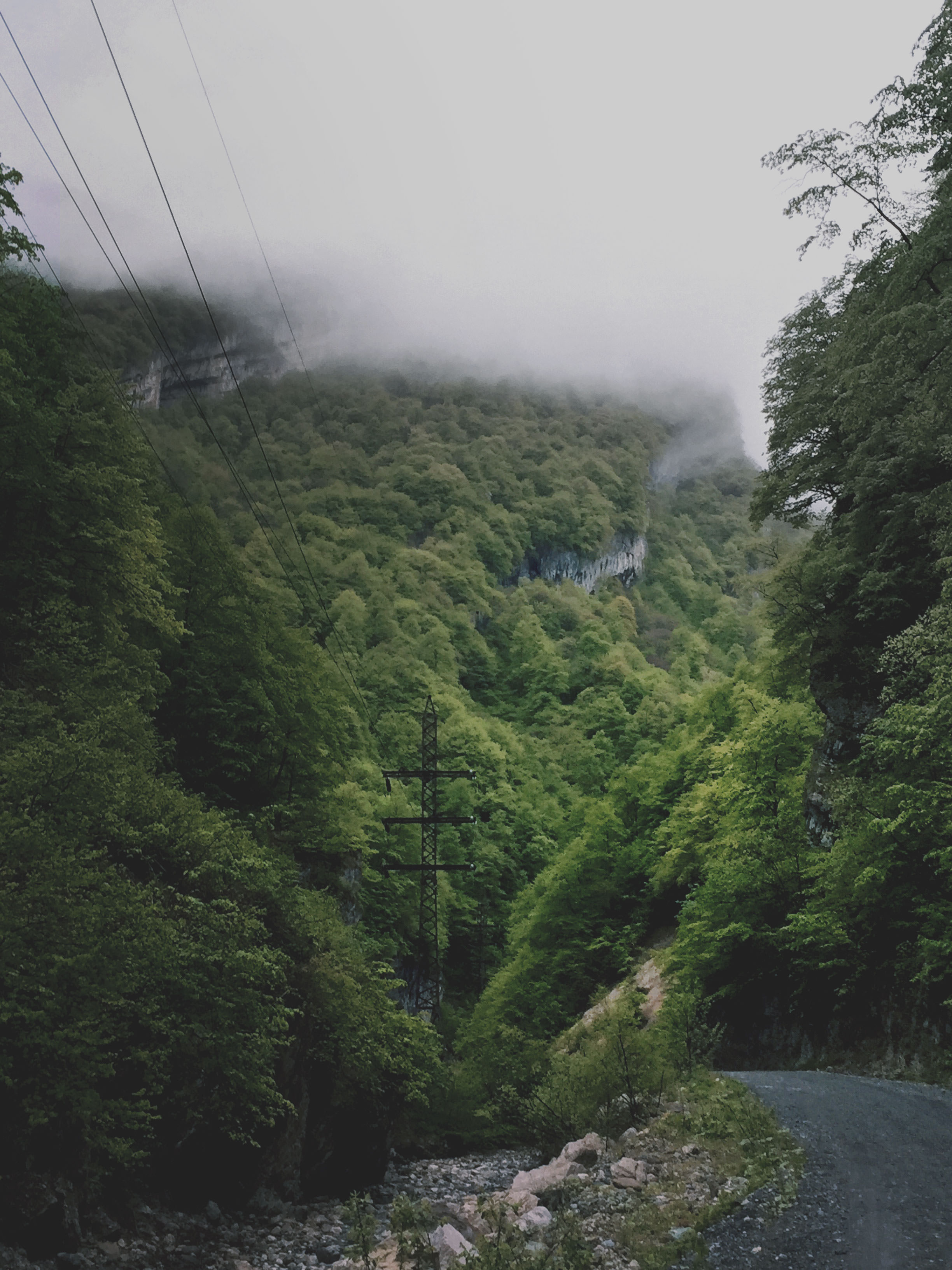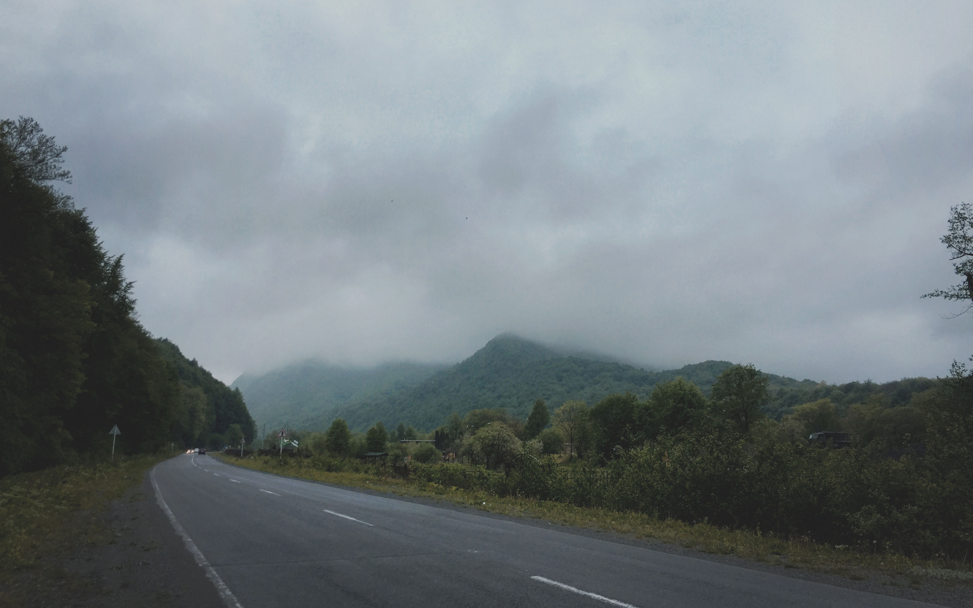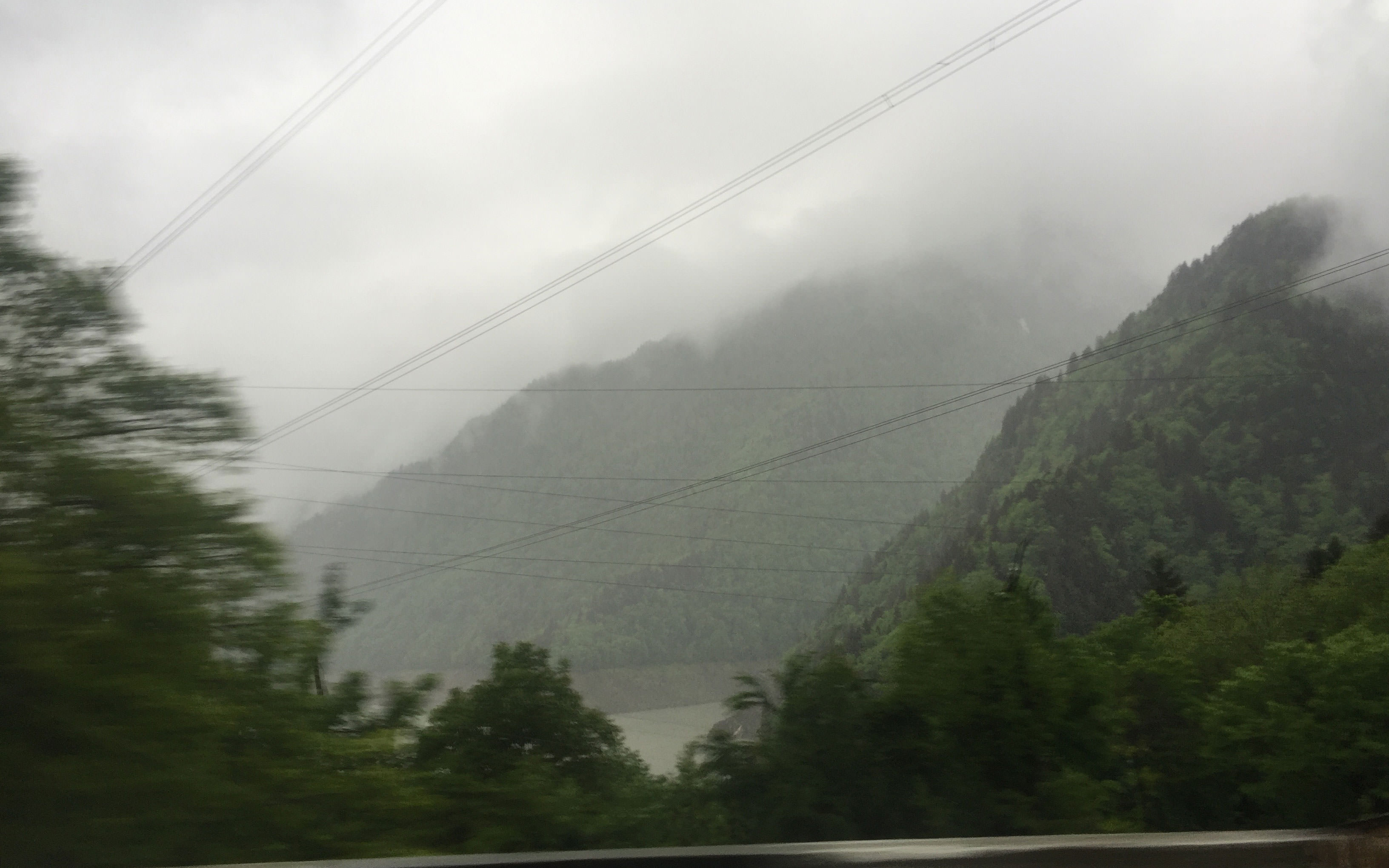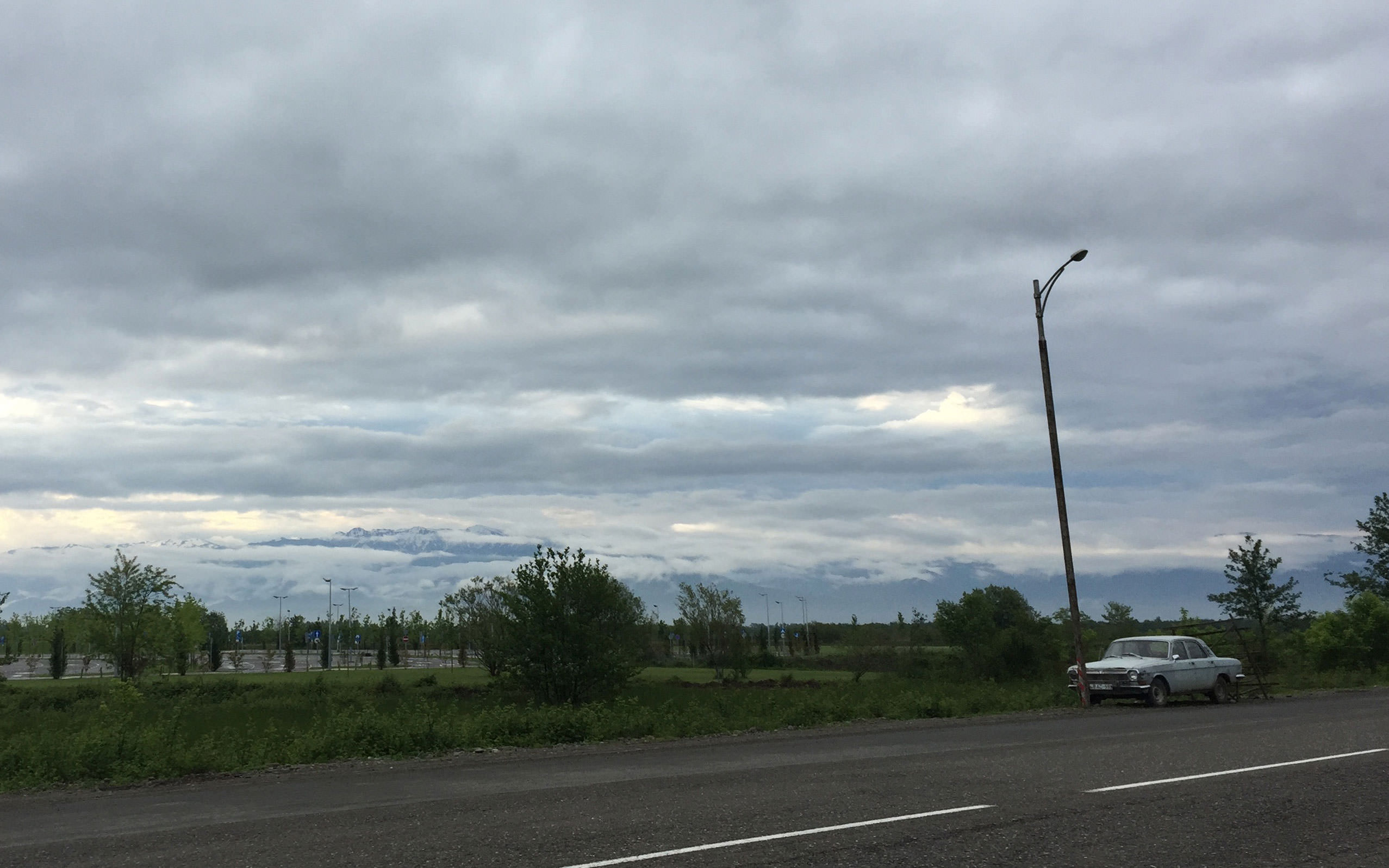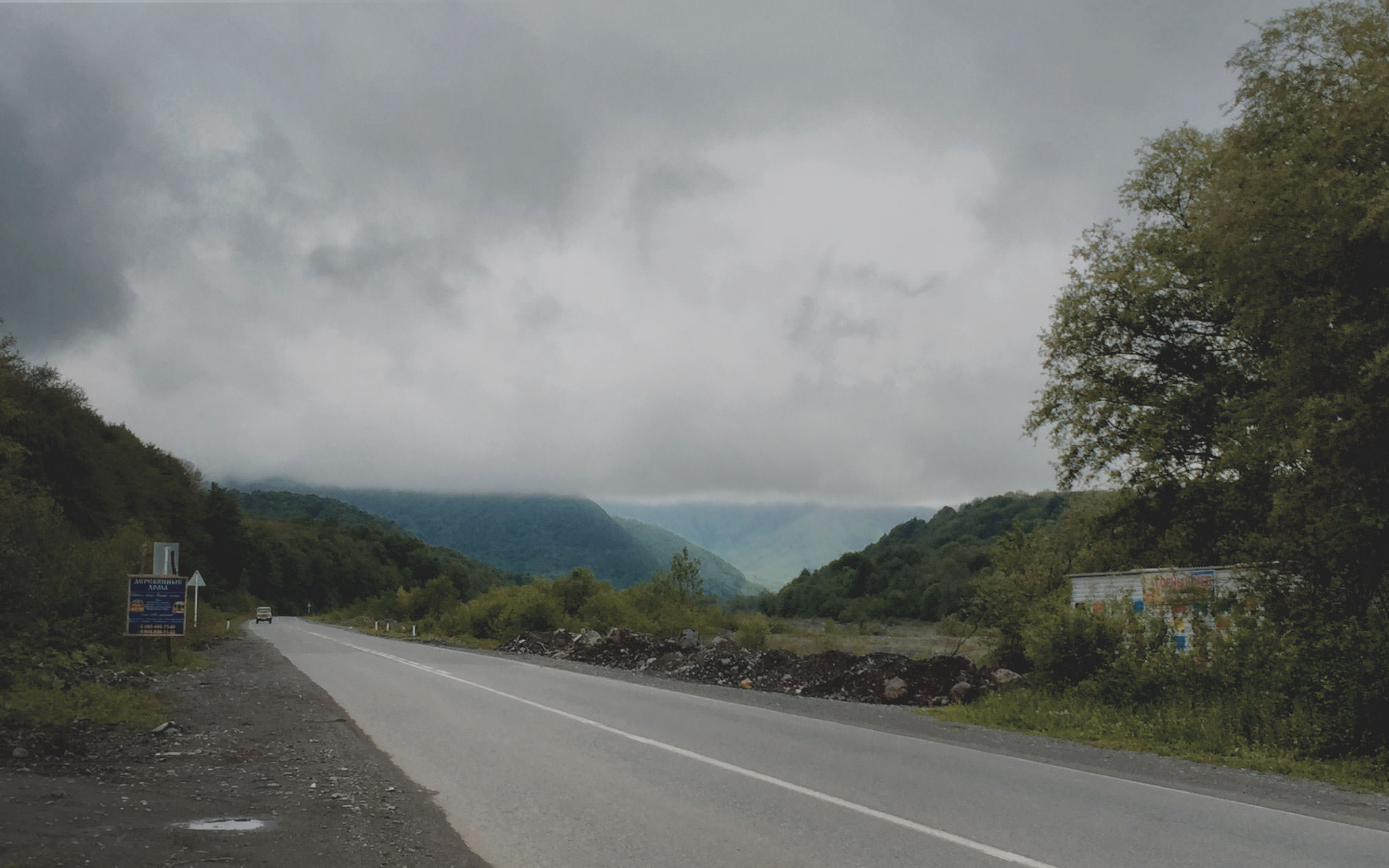 Идет сильный дождь, и те же места выглядят совсем не так, как в первую поездку. В машине снова отвратительная музыка, смесь попсы с шансоном. Репертуар был небольшой, всё на репите, так что каждую песню я прослушал раз пятнадцать. Иностранцы спрашивают, грузинская ли это музыка. Я отвечаю, что русская, хотя сделана с уклоном в грузинскую народную музыку.