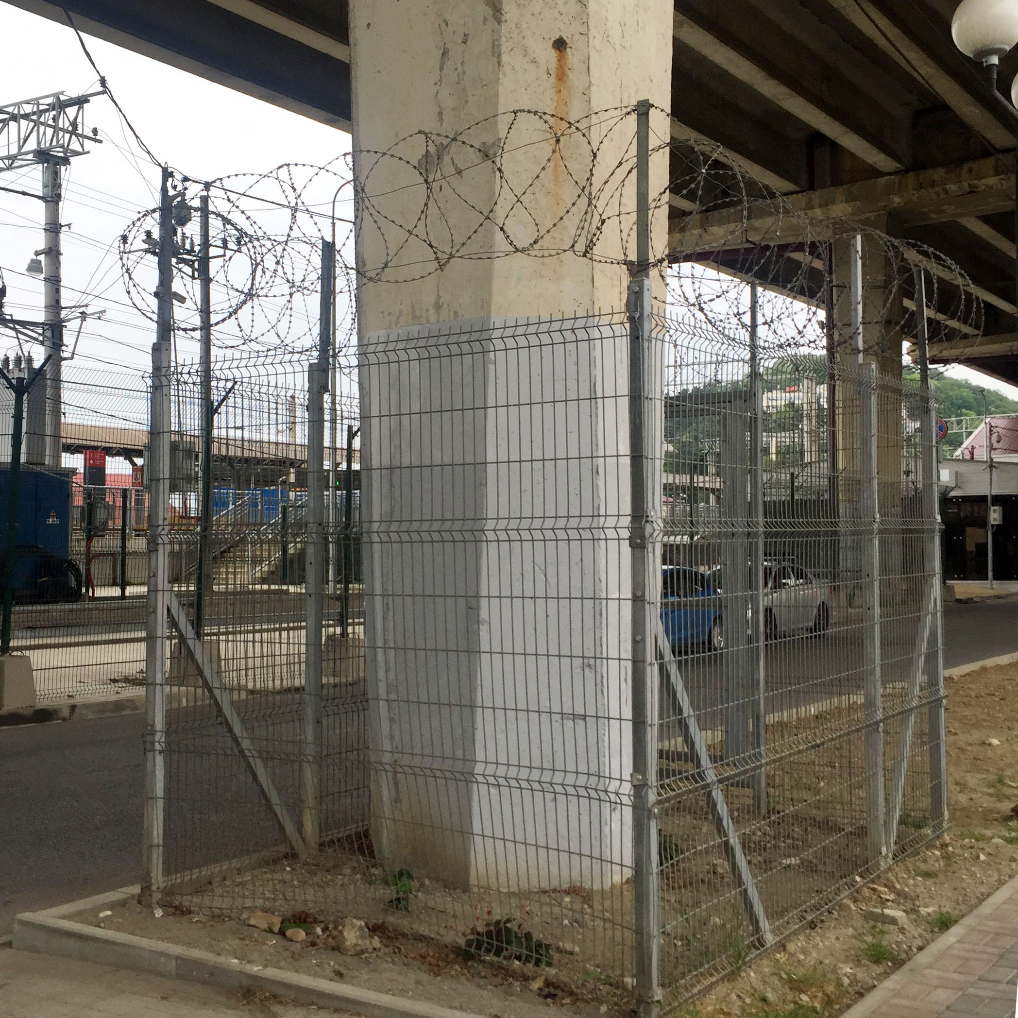 Каждая опора мостов огораживается забором с колючей проволокой и четыремя камерами наблюдения, разглядывающими все подступы сверху, ибо недостаточно безопасно. Кажется, это был самый охраняемый кубометр бетона в мире.