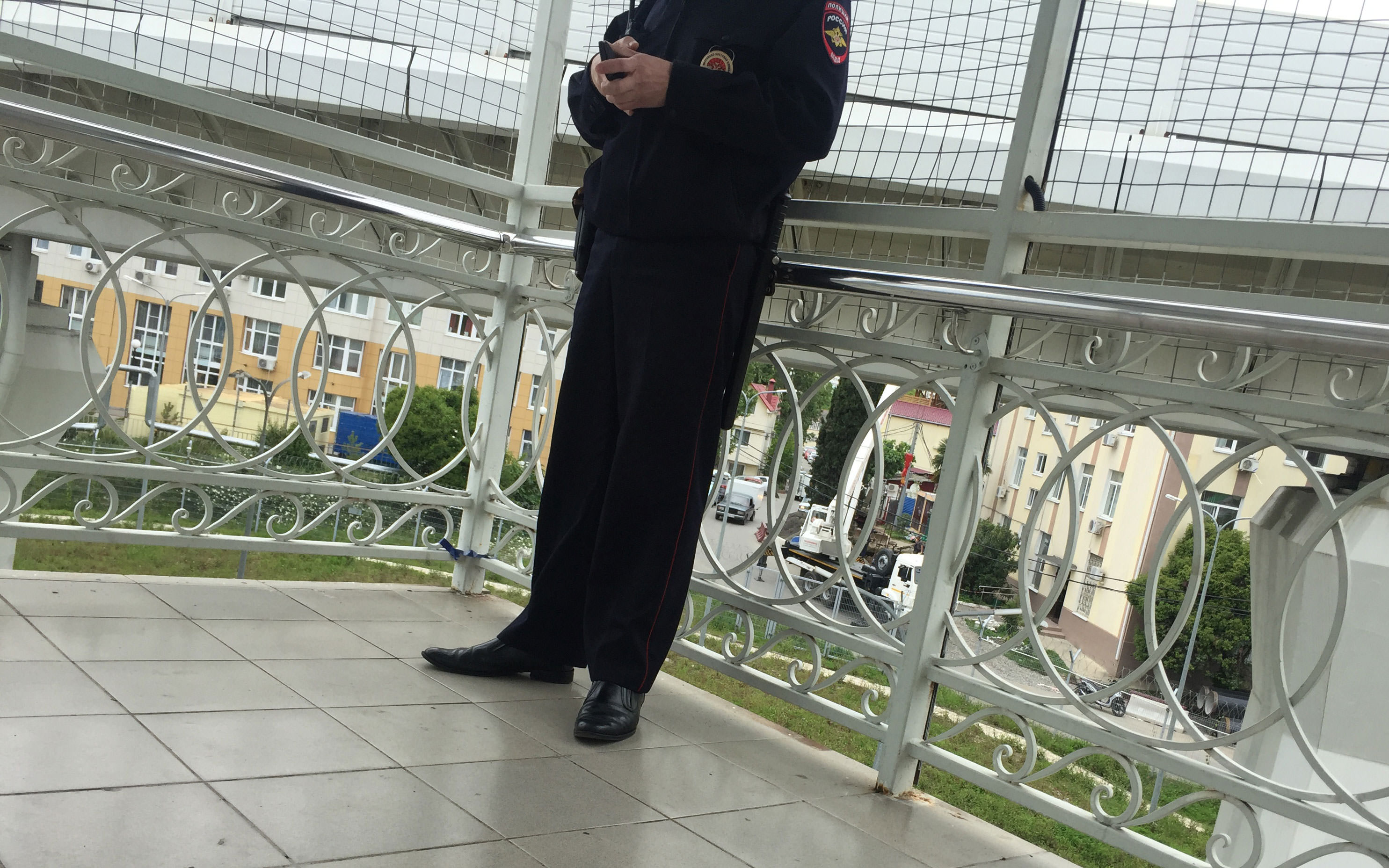 Каждый надземный или подземный переход сторожат менты, ибо недостаточно безопасно. Иногда аж втроем: один слева у подъема, другой справа у подъема, третий (видимо, старший) на самом мостике.