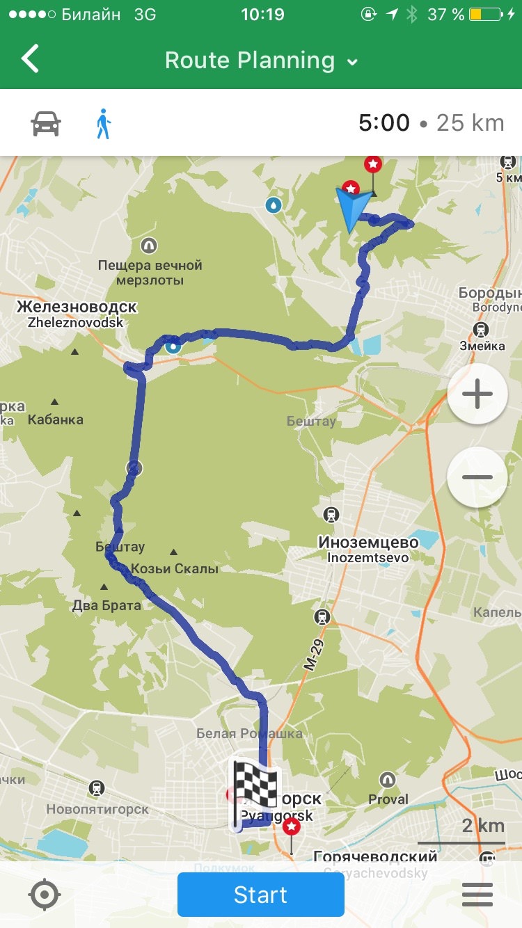 Пора было спускаться и продолжить свой путь. Цель на день — добраться до Пятигорска. По трассе идти не хотелось, и мапс.ми выдал мне вроде адекватный маршрут: 25км, 5 часов пешего пути.