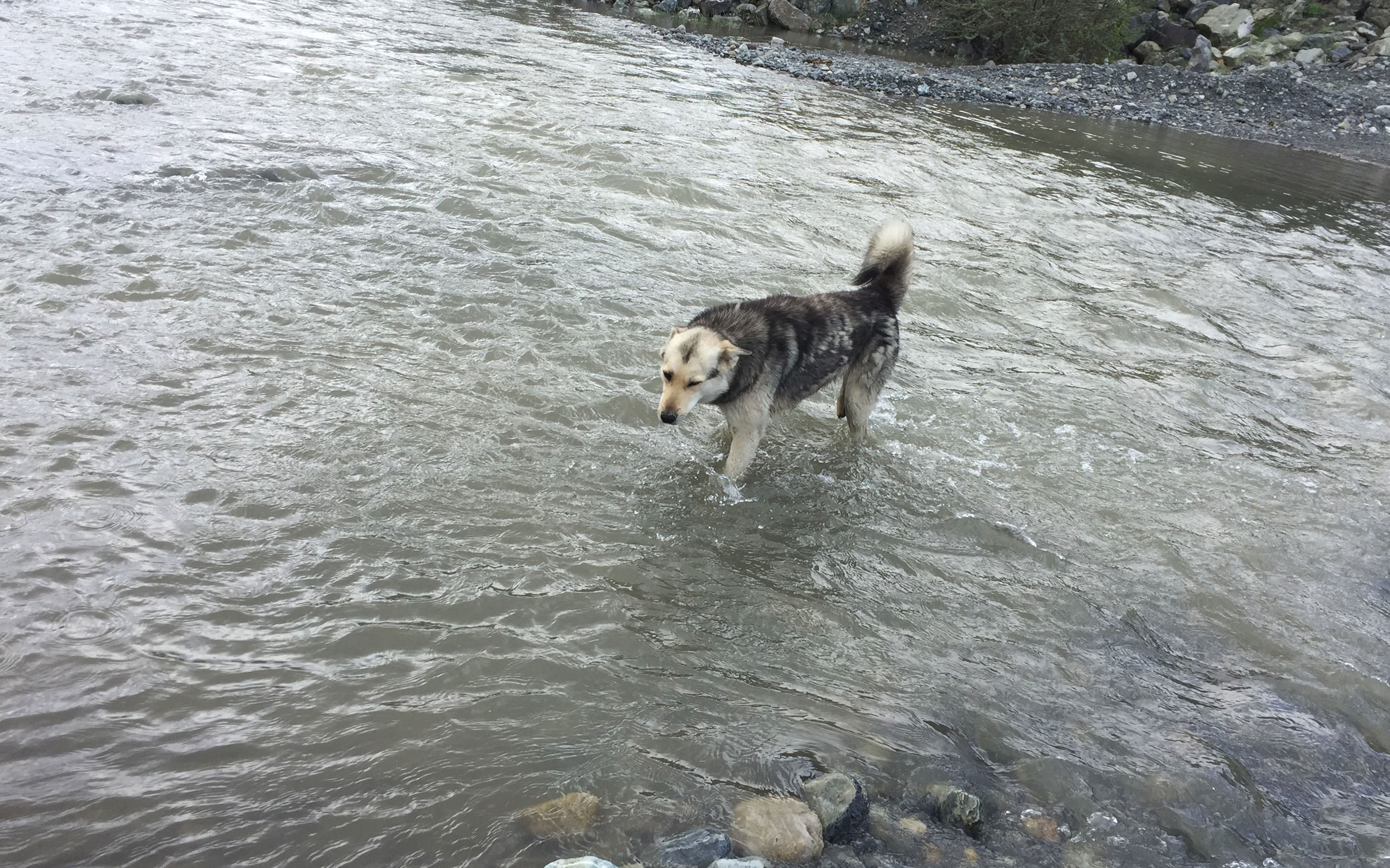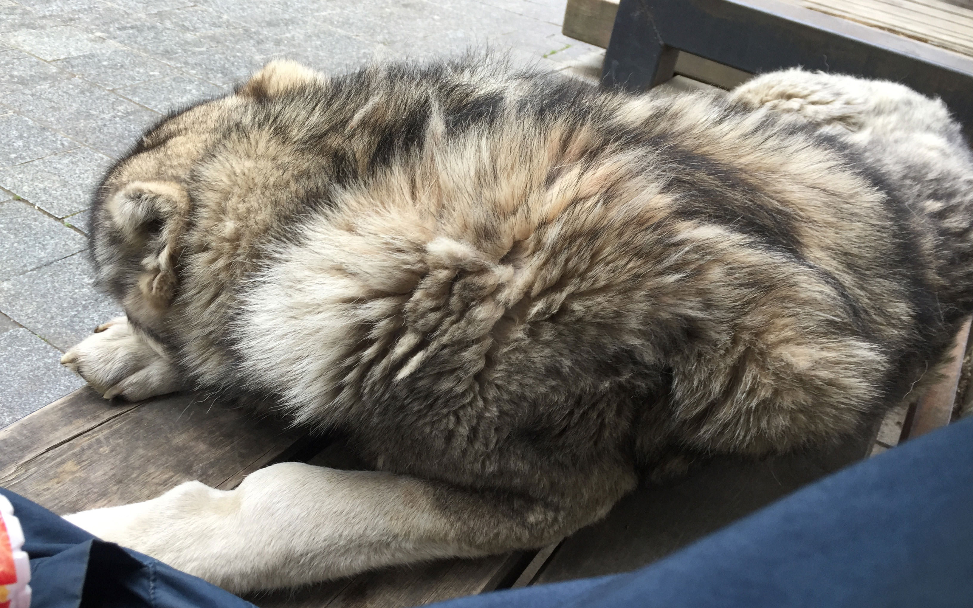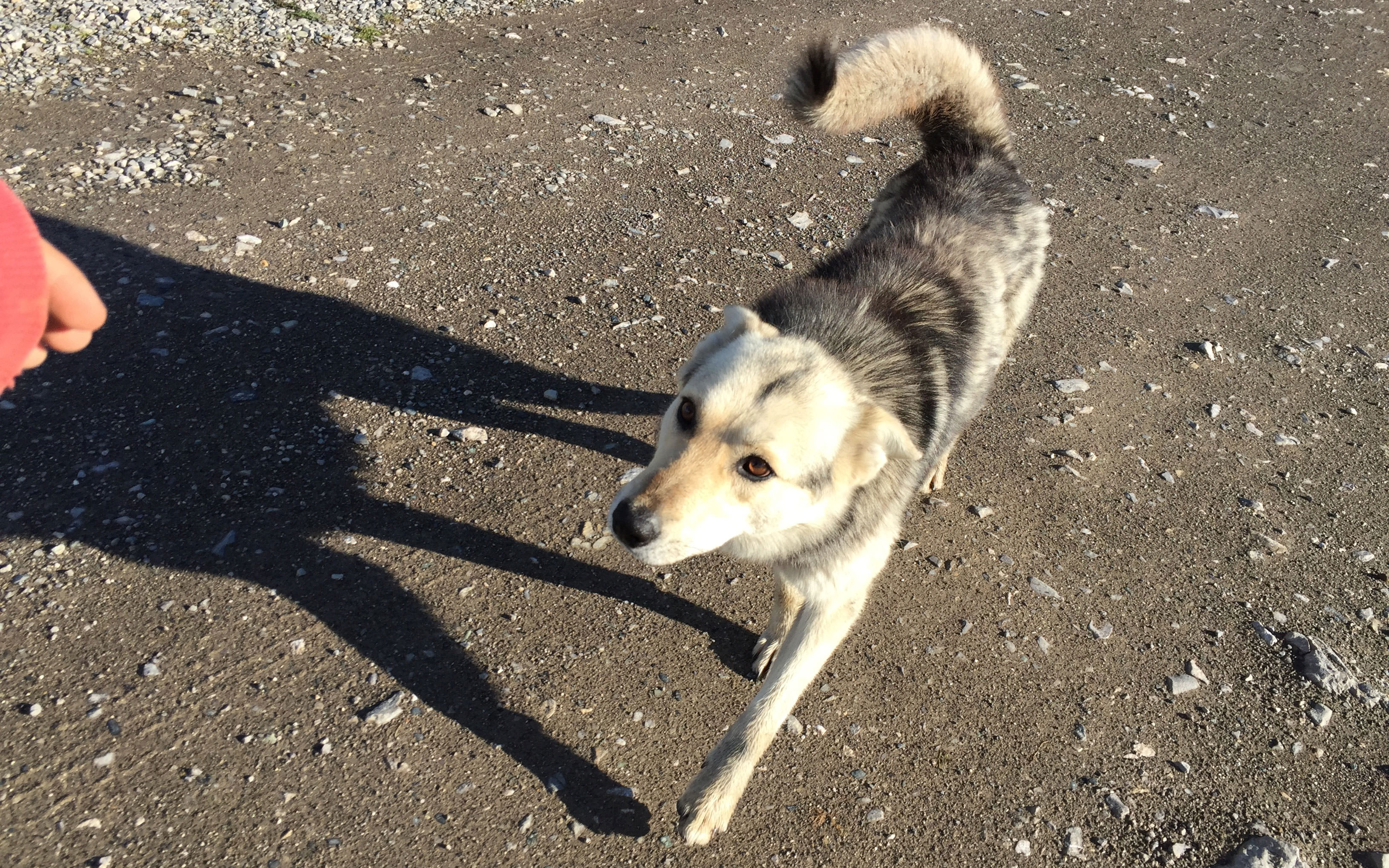 Ко мне снова привязалась уже безумная собачуля. Вроде большая, а как щенок. Только увидела — замахала хвостом, спрыгнула со своего участка и ко мне. Всё хотела что-нибудь пожевать — руки, ноги, провод от зарядки, лямки рюкзака, много раз пристраивалась сзади пожевать мой коврик. И рычала, что я с ней не играюсь.