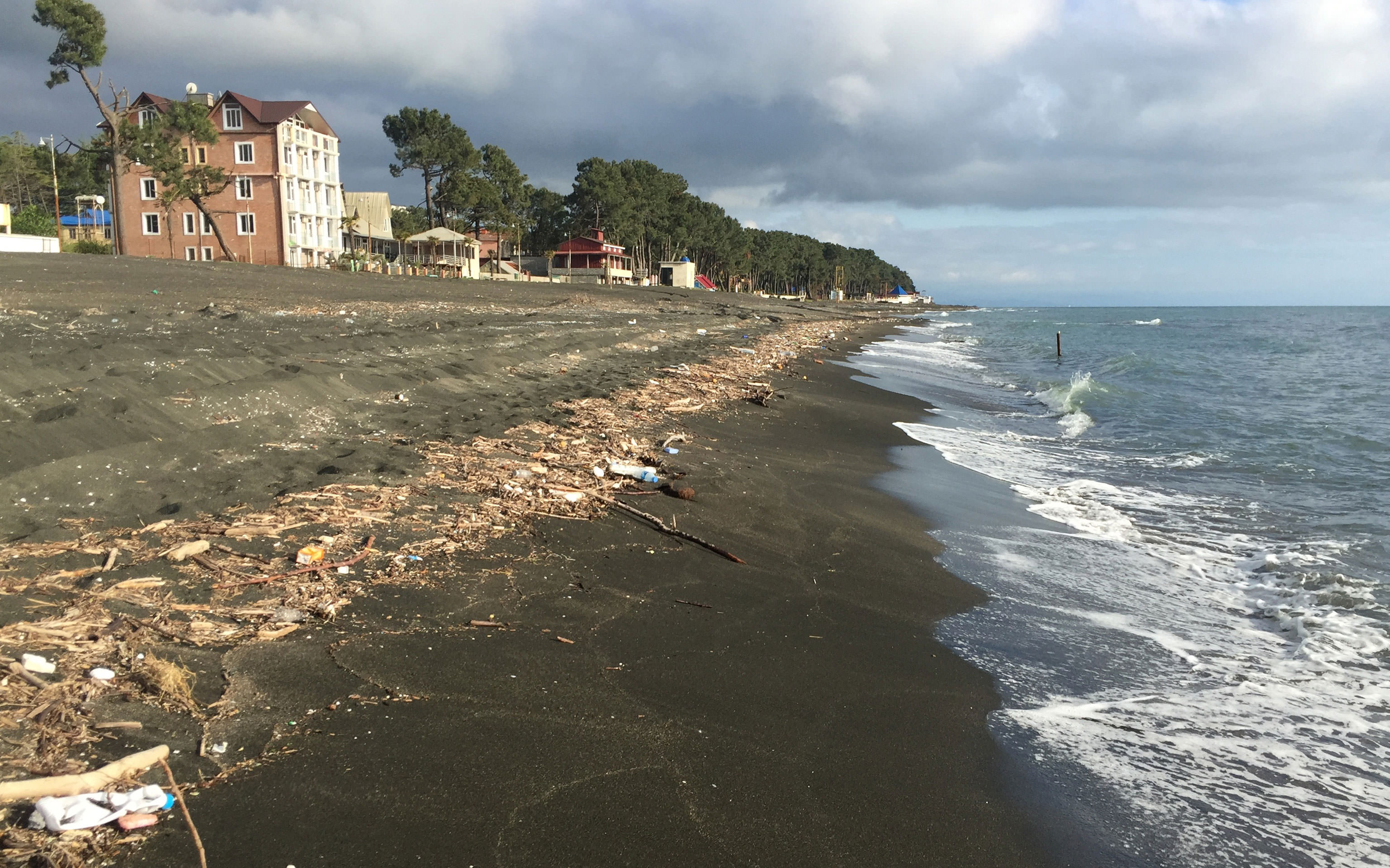 Приезжаю в Зугдиди, здесь пересаживаюсь на маршрутку до прибрежного города Уреки. Тут вроде как известные черные «магнитные» пески, но на деле скорее помойка. Прогулка босиком по такому пляжу — отличный способ подцепить СПИД.