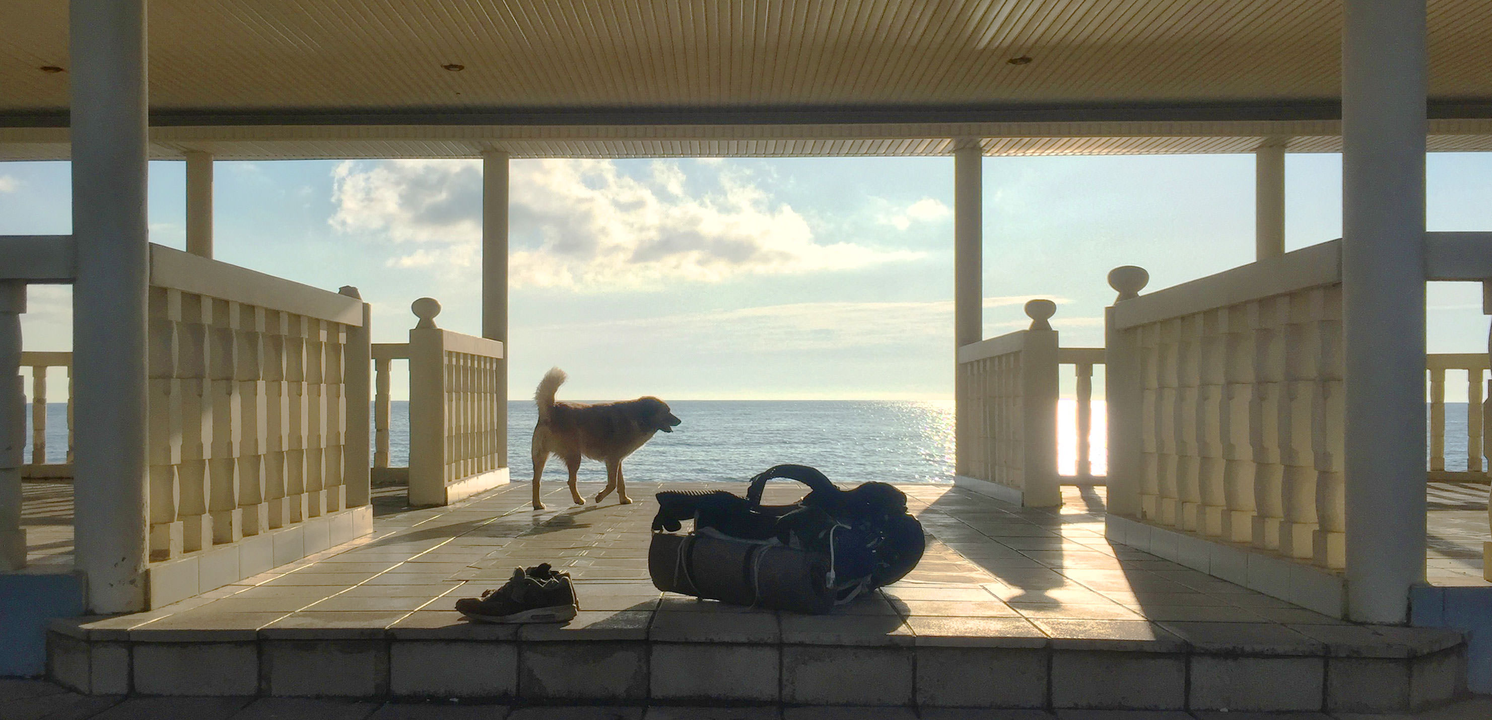 Уже затемно, так и не нашел подходящего места для ночевки. Мне уже все равно, спускаюсь на один из частных пляжей, скрываюсь от взора охранника и незаметно в укромном месте под бетонным козырьком ставлю палатку.